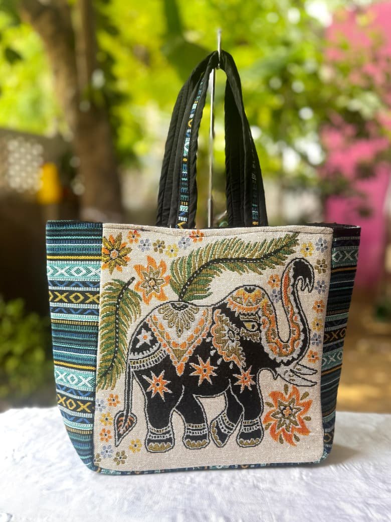 Material: made of a woven fabric jute or a similar textured material, with a tapestry-like panel on the front.