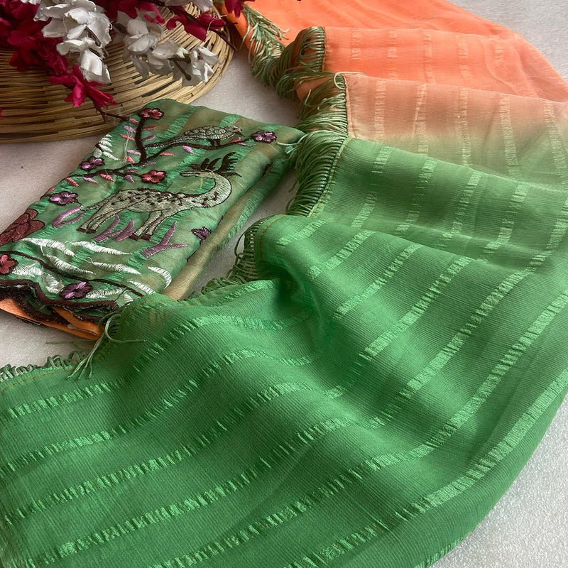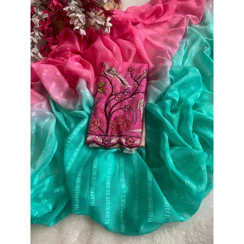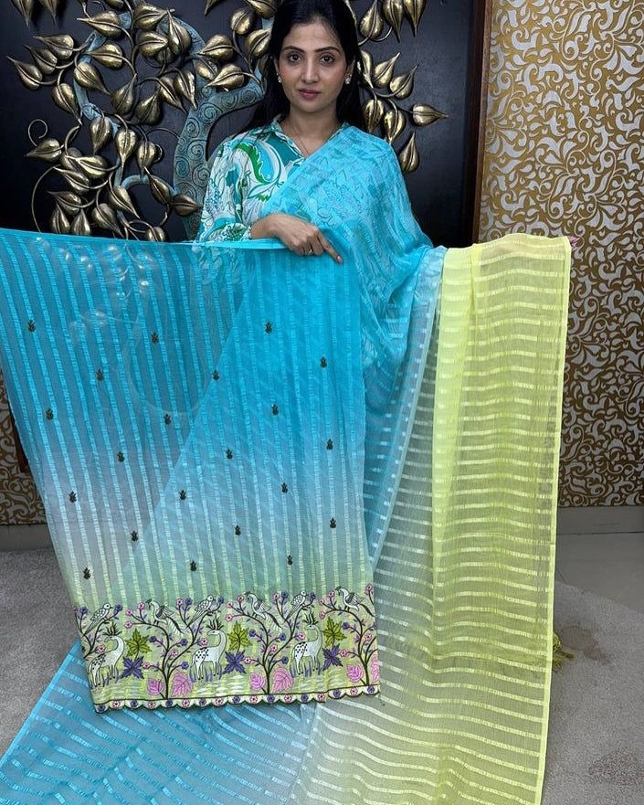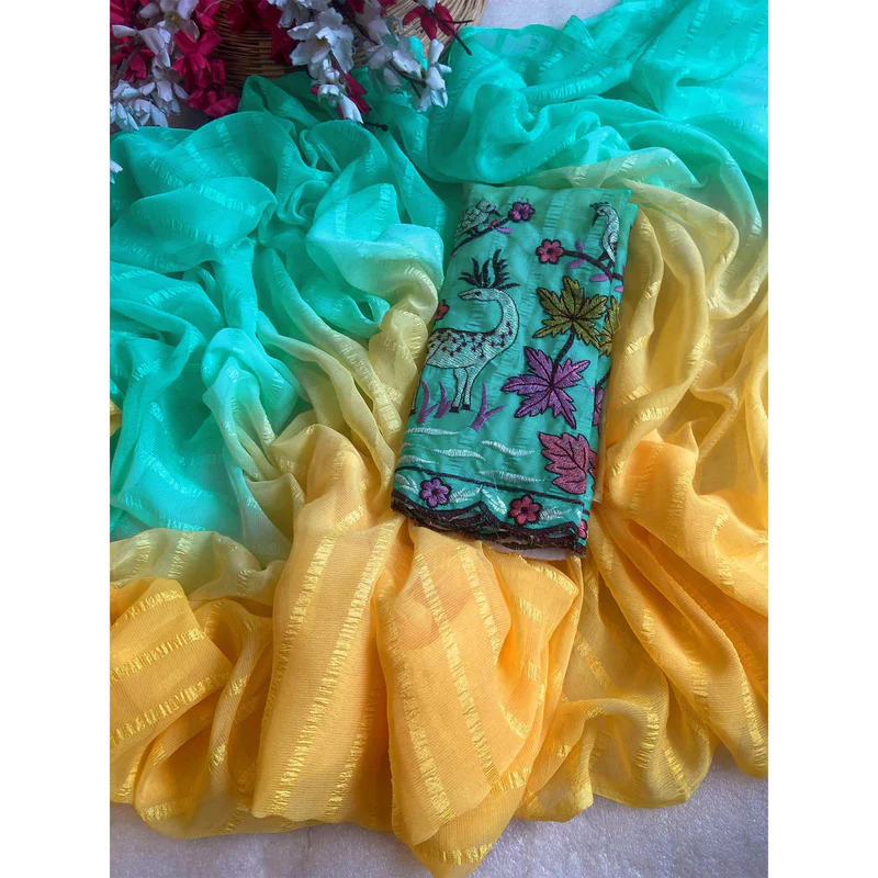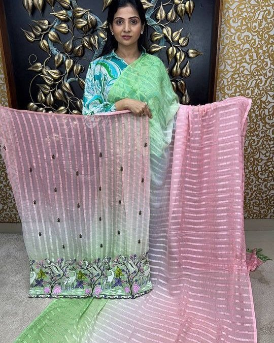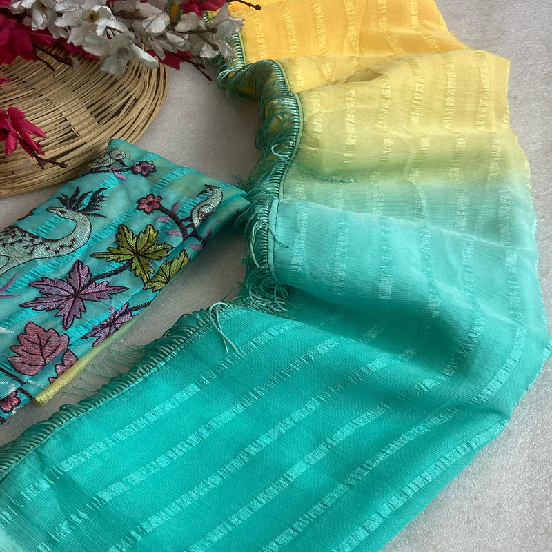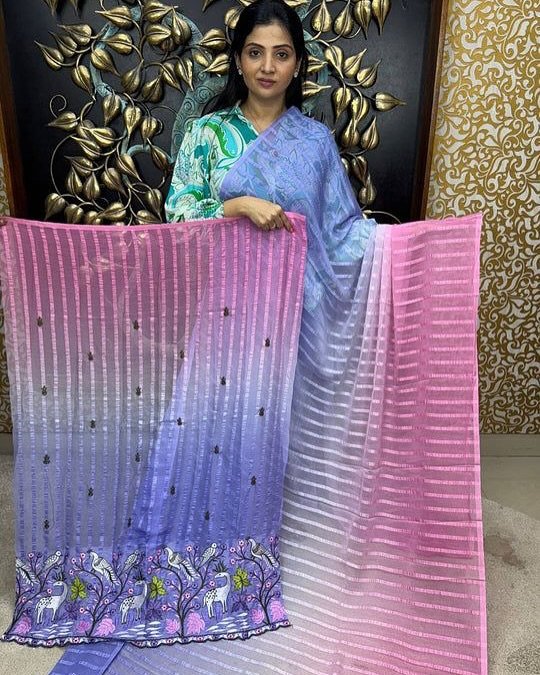 | Solo pattern prisom padding with beautiful pipping with tone to tome heavy embroidary blouse,The lightweight nature of the saree allows it for comfortable wear without feeling bulky |