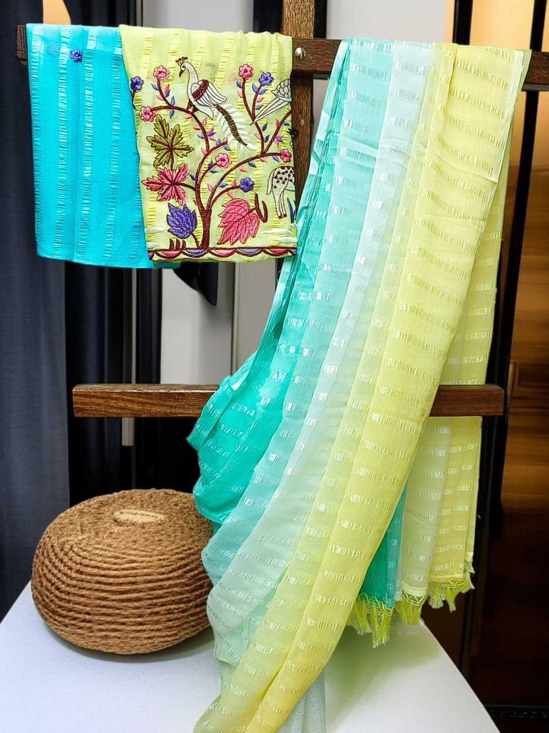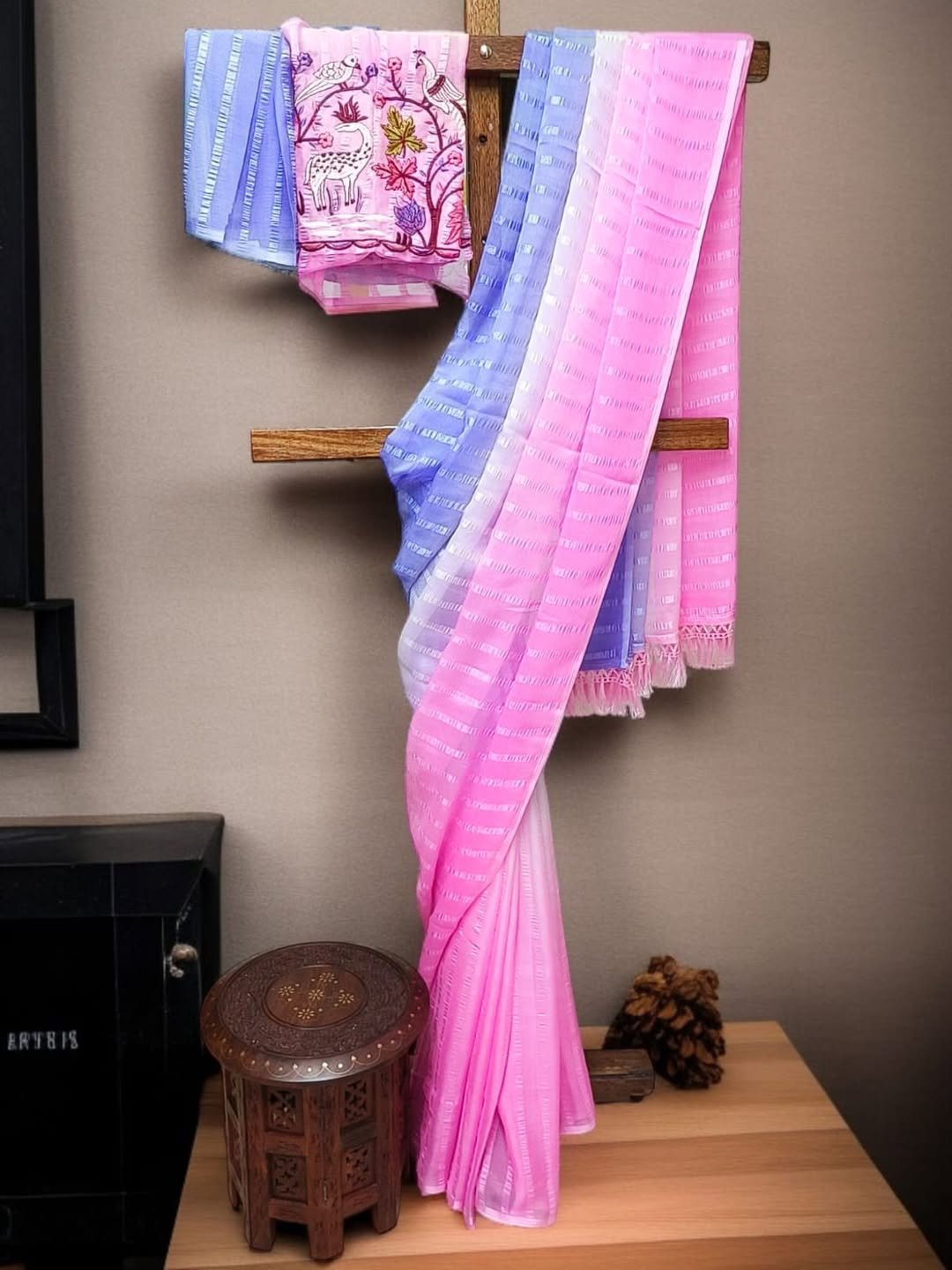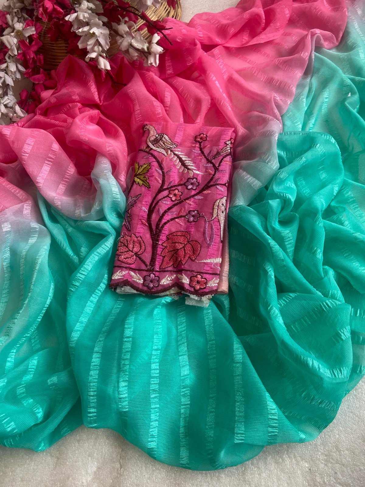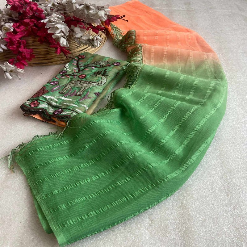 | Solo pattern prisom padding with beautiful pipping with tone to tome heavy embroidary blouse,The lightweight nature of the saree allows it for comfortable wear without feeling bulky |