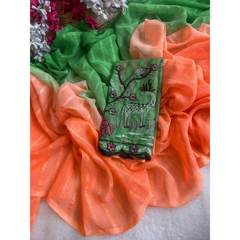 | Design Pattern : The saree has a crushed texture and may include foil work, adding to its visual appeal. |