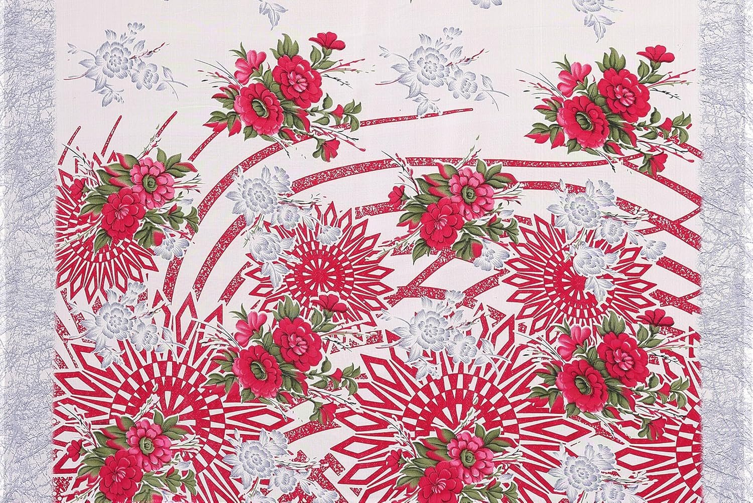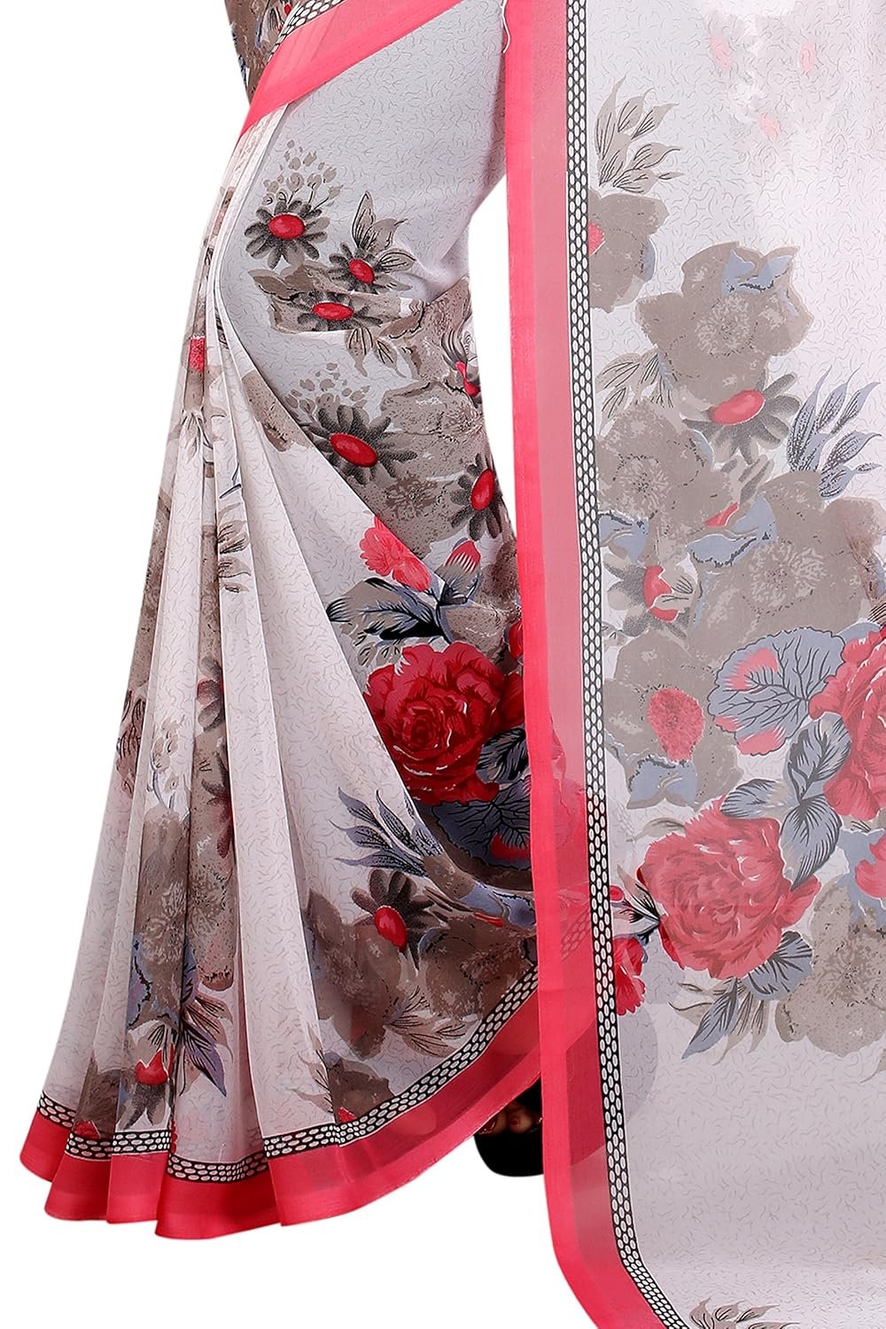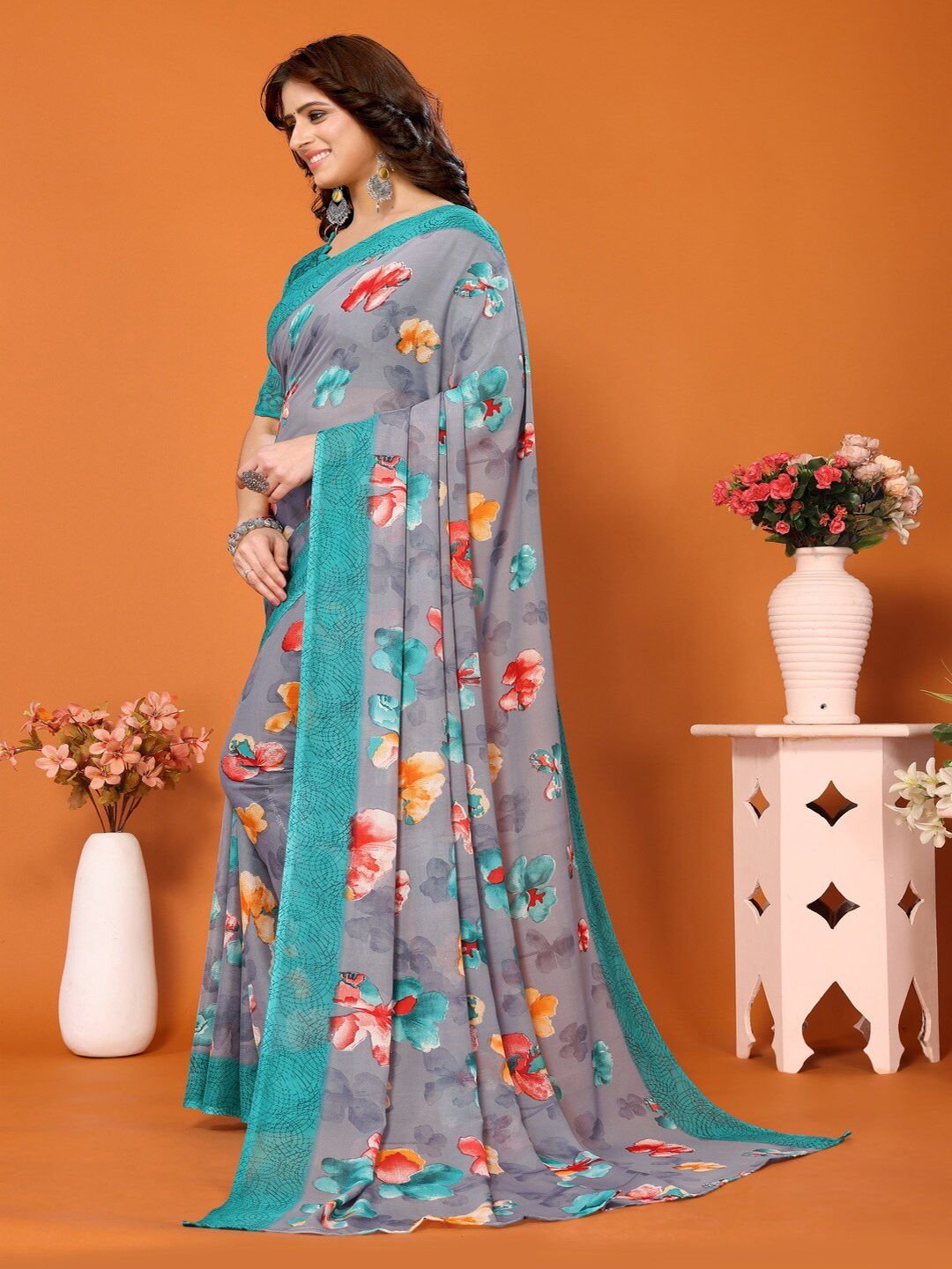 | Design Pattern : prominent floral print with large and small flower motifs, The design extends to the border of the saree, maintaining the floral motif. |