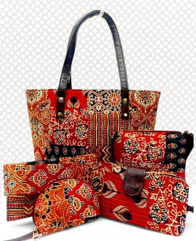 | Handcrafted Tote Bag, (Set of 5) elegant & ethnic designs(Main bag with 2 Zip Partitions) |