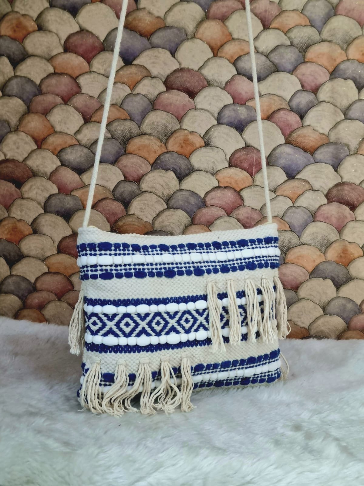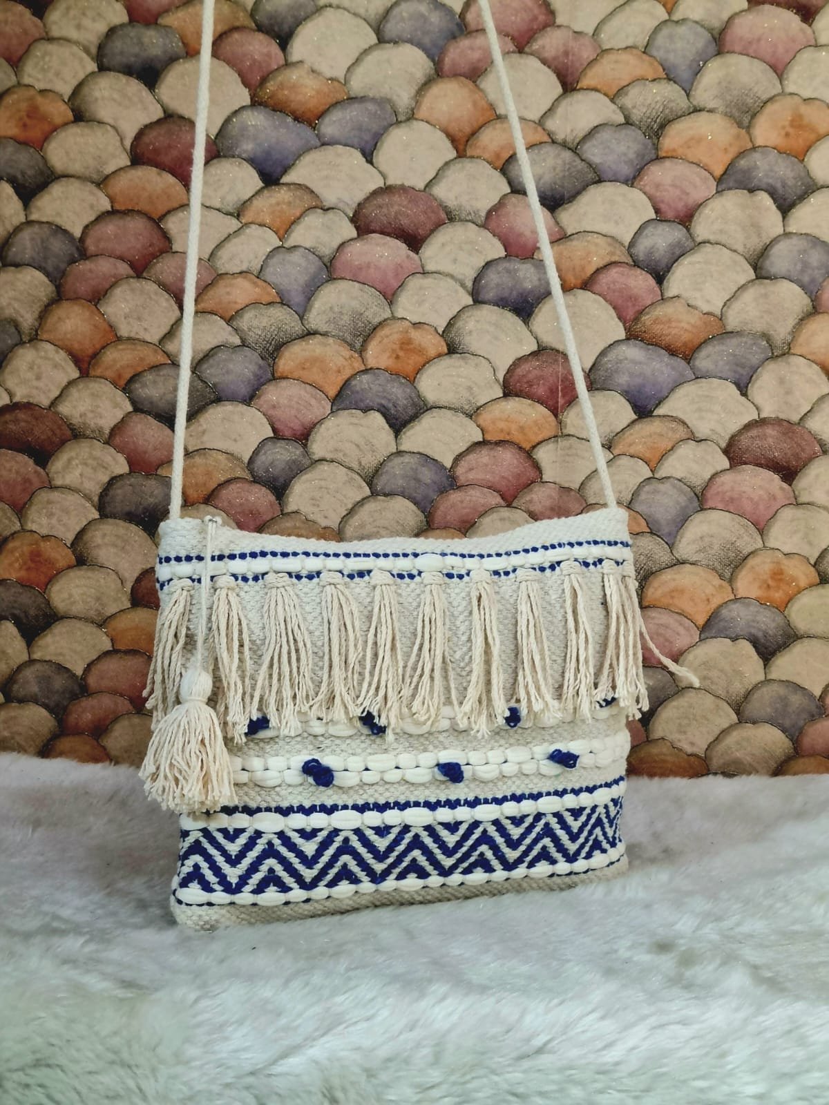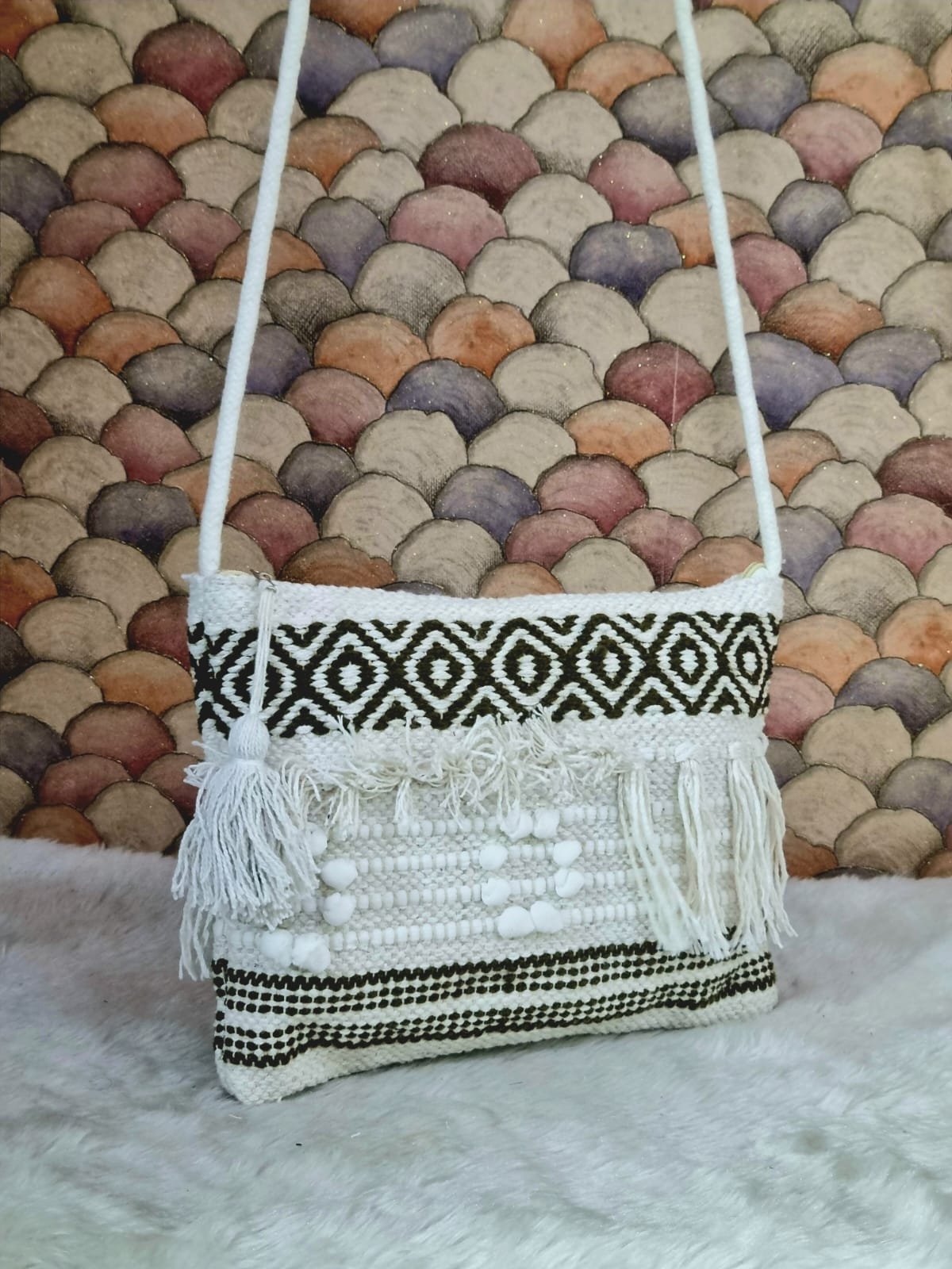 | Design Pattern : Features a prominent fringe detail along the top flap,Includes decorative woven patterns and small embellishments, likely beads or knots, in a contrasting color,Has a distinct patterned band at the bottom, showcasing intricate thread work or embroidery. |