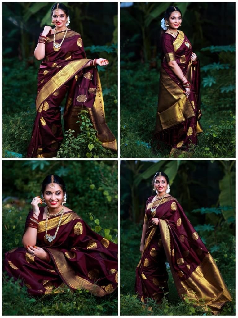| Litchy Silk saree, heavy, rich pallu (the decorative end piece of the saree) and a border with detailed Zari work and buttis (small woven motifs). Adorned with intricate Zari weaving, which can include gold or silver threads, forming elaborate patterns and motifs |