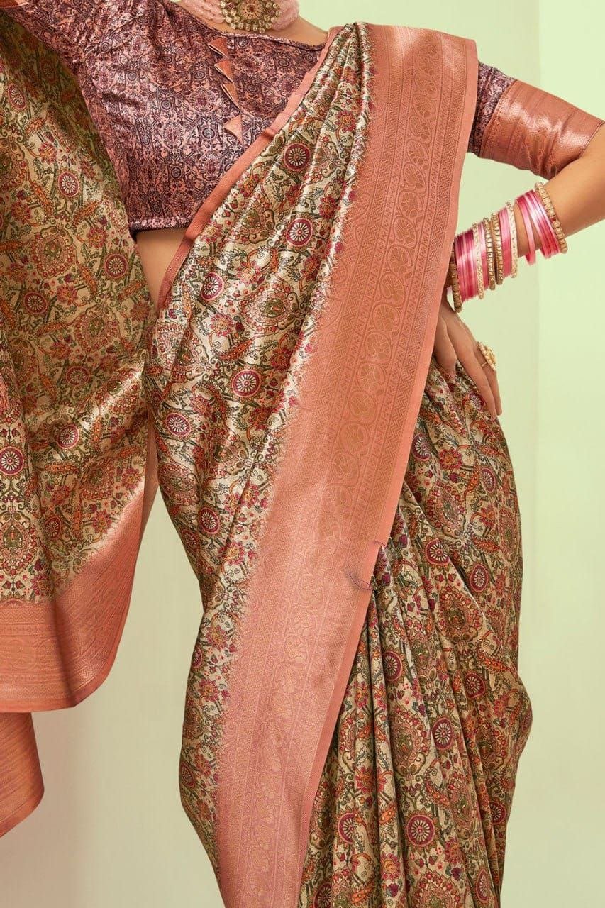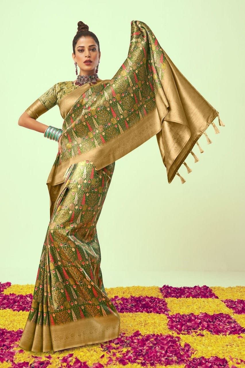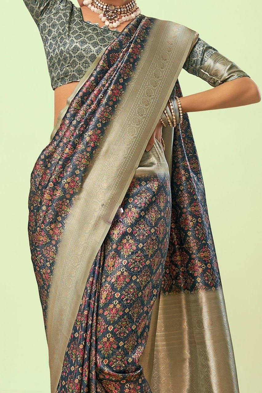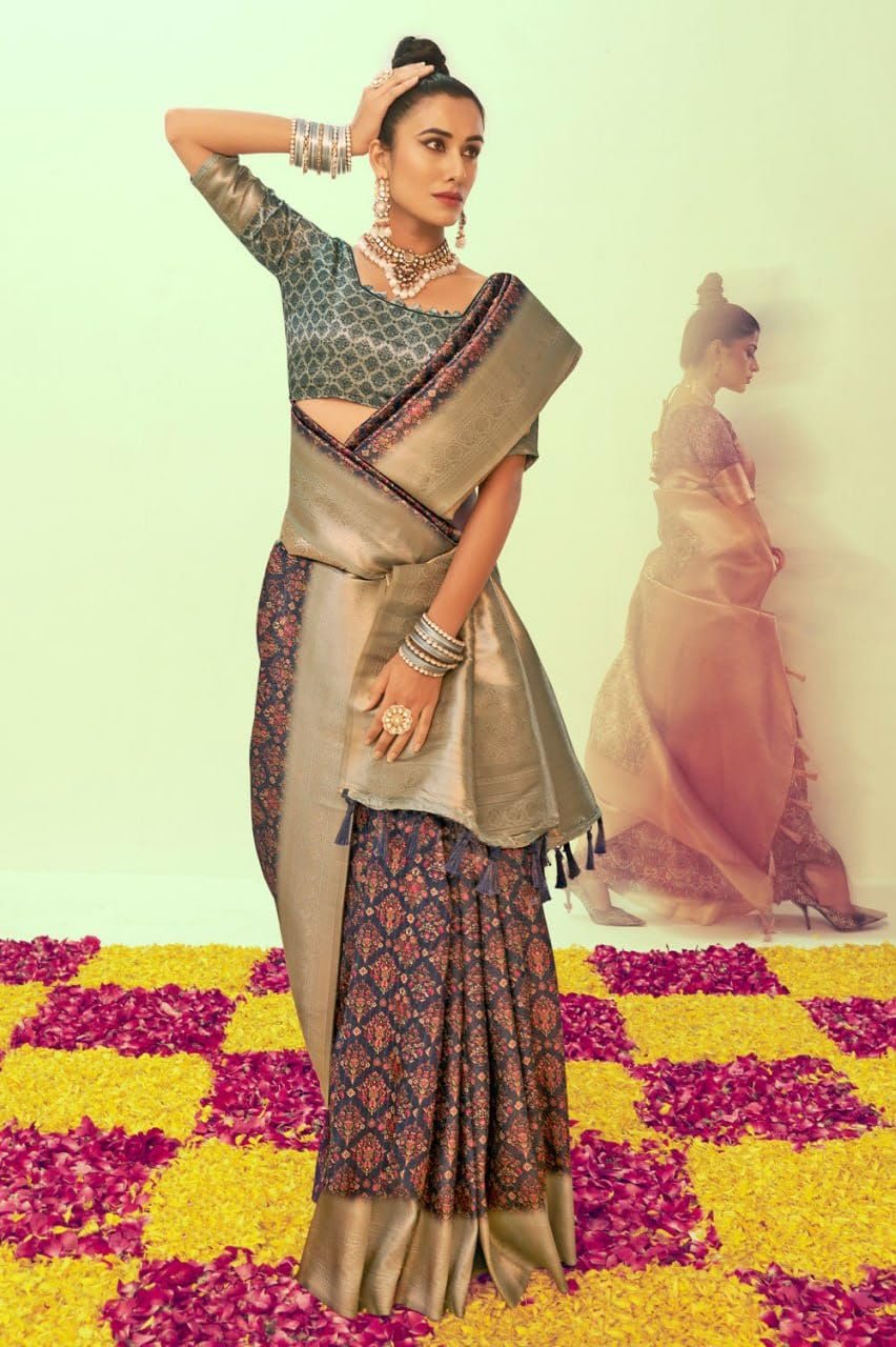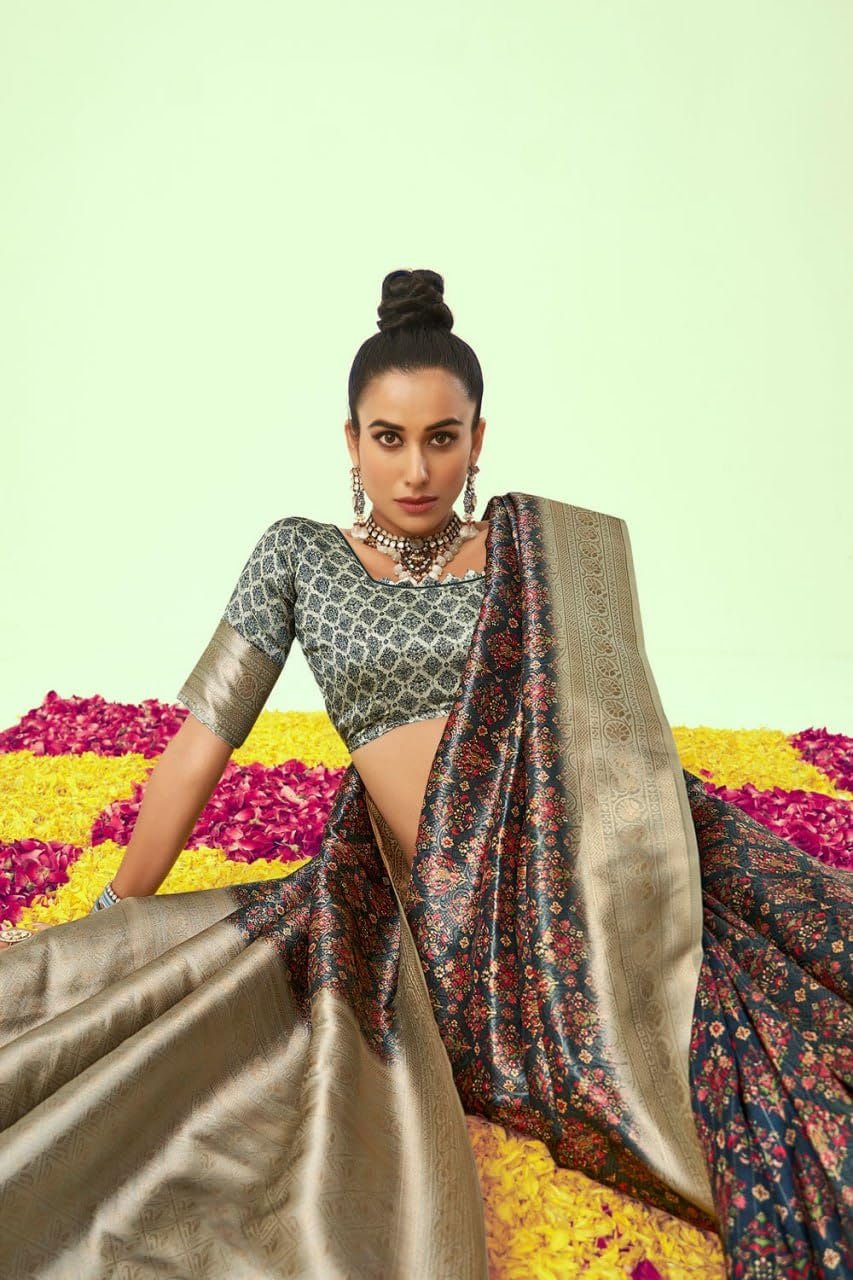 | Design Pattern :Features traditional digital prints throughout the body and a rich, grand pallu a contrasting woven border. |