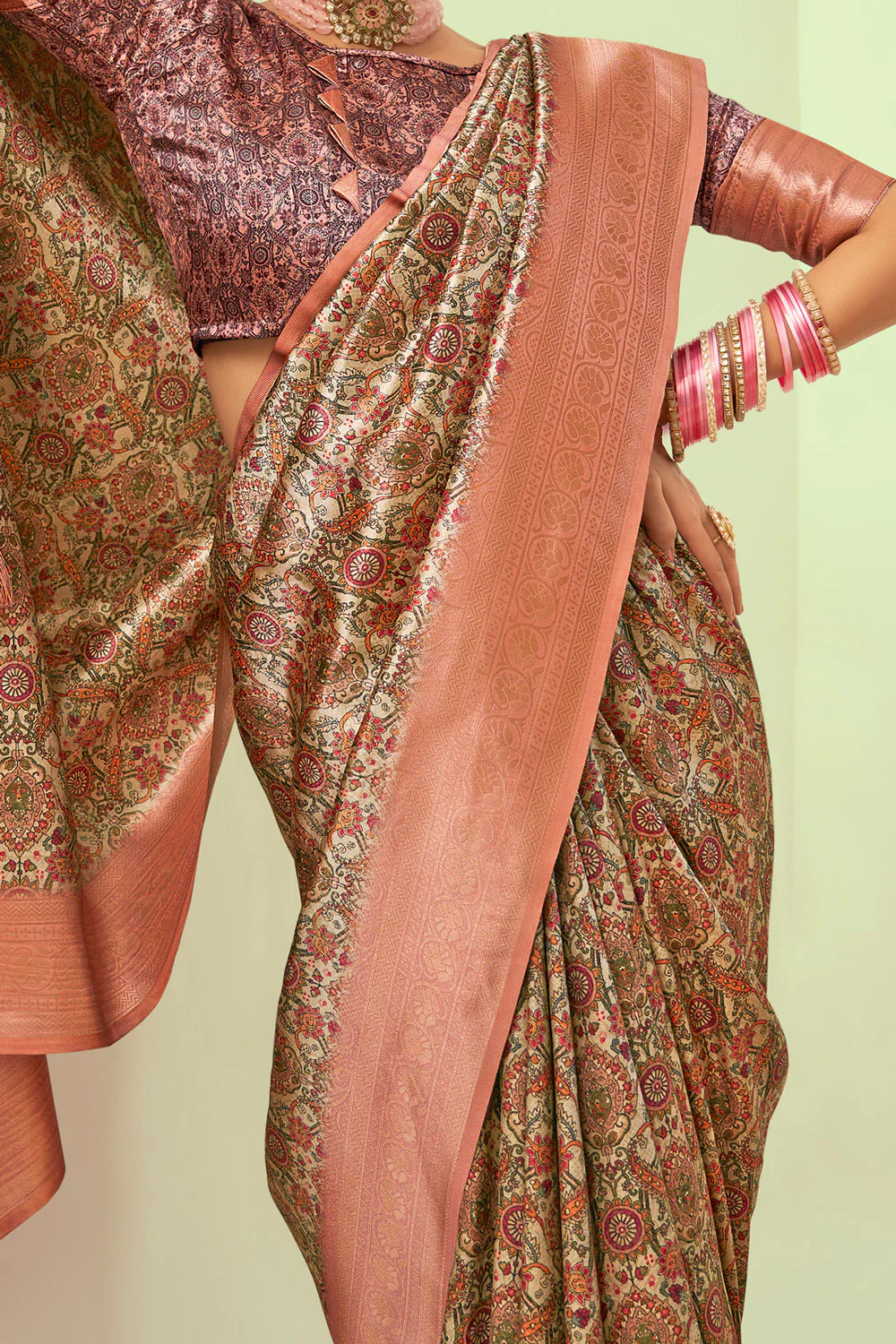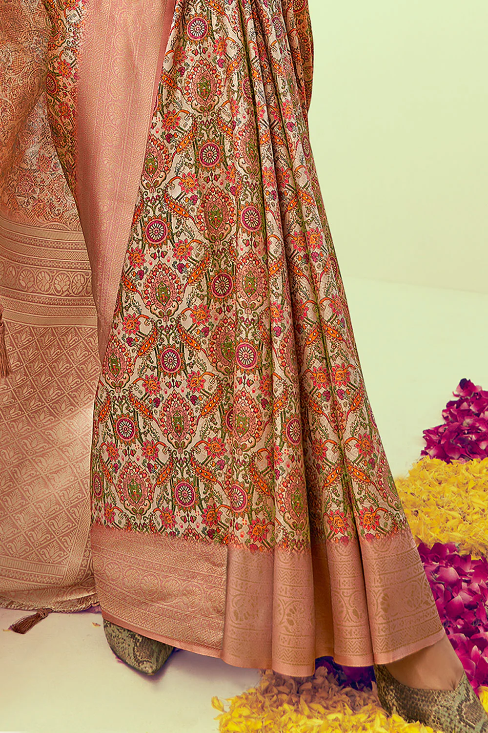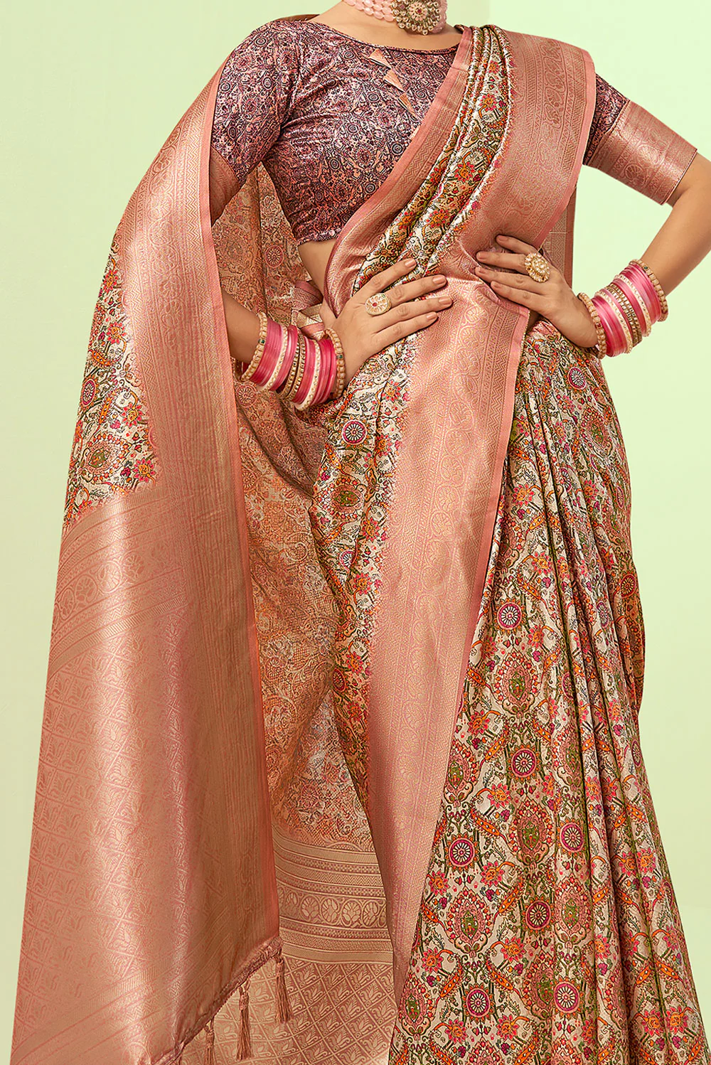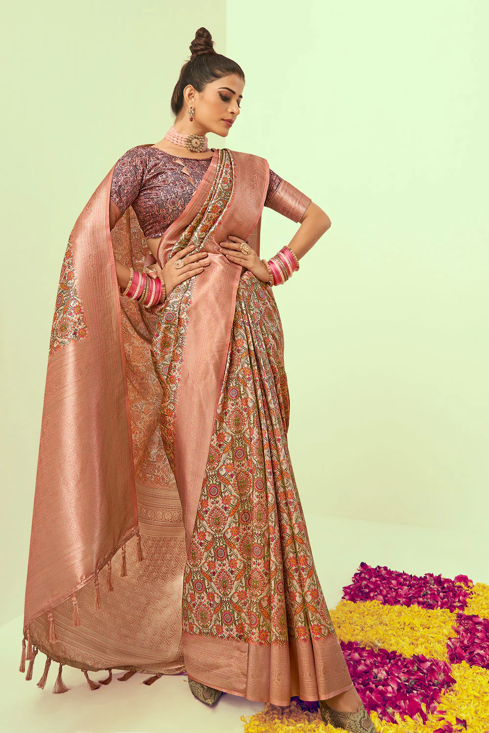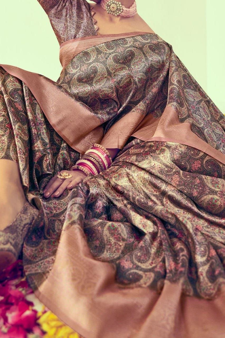 | Design Pattern :Features traditional digital prints throughout the body and a rich, grand pallu a contrasting woven border. |
